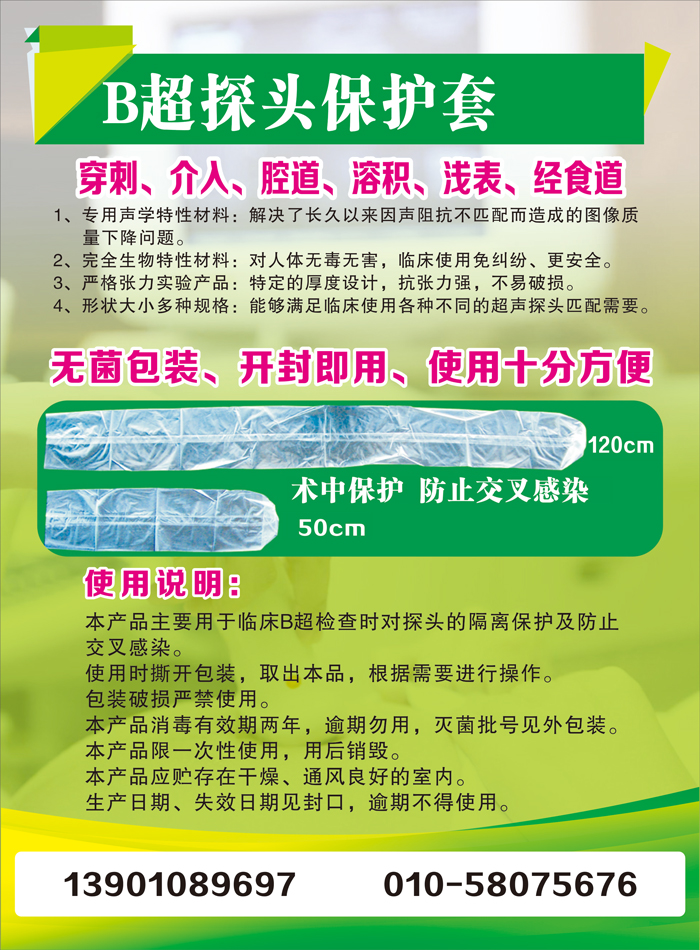浅表器官超声检查时由于没有无菌保护套,只能用裸体探头给患者检查,由于检查的部位不同,有腹沟部位、淋巴部位、乳房、眼睛等部位。鉴于患者的卫生条件,容易造成交叉感染。同时也不卫生,上一位患者做睾丸或附件下一位患者做乳房或眼睛,只是用卫生纸擦一下能卫生吗?上一位患者如患有传染性疾病,如:甲肝、乙肝、流感、艾滋、滴虫。下一位患者要承担多大的风险啊。如患者超声部位的皮肤过敏或有损伤,没有无菌保护探头加大了患者交叉感染的风险。还有超声穿刺检查及术中超声治疗,由于缺少有效保护探头避免交叉感染的措施,极易给患者造成交叉感染的风险。B超探头保护套。国家相关单位批准的医疗器械产品,能有效地将探头与患者隔离,防止患者疾病交叉感染,卫生、安全、可靠,还能防止探头的磨损、开裂,延长探头的使用寿命。操作简单,使用方便。