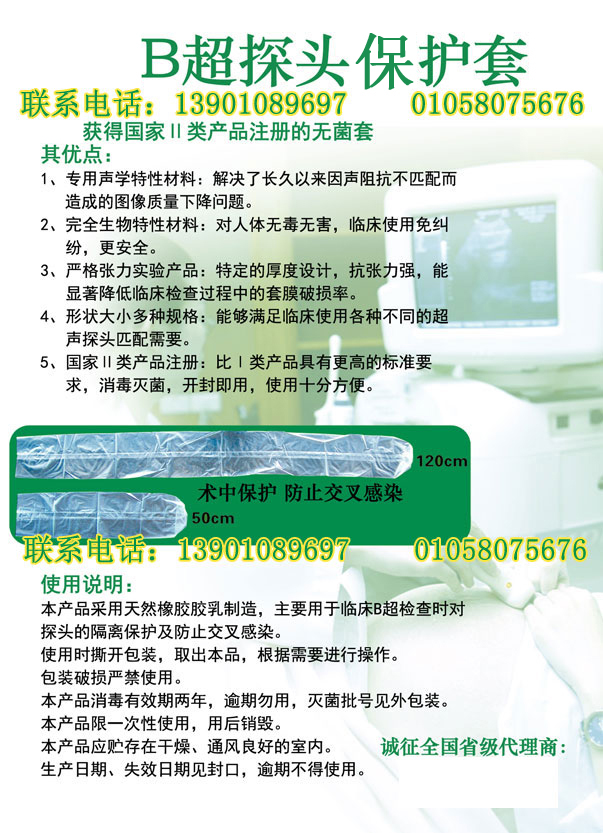 浅表器官超声检查时由于没有无菌保护套,只能用裸体探头给患者检查,由于检查的部位不同,有腹沟部位、淋巴部位、乳房、眼睛等部位。鉴于患者的卫生条件,容易造成交叉感染。同时也不卫生,上一位患者做睾丸或附件下一位患者做乳房或眼睛,只是用卫生纸擦一下能卫生吗?上一位患者如患有传染性疾病,如:甲肝、乙肝、流感、艾滋、滴虫。下一位患者要承担多大的风险啊。如患者超声部位的皮肤过敏或有损伤,没有无菌保护探头加大了患者交叉感染的风险。还有超声穿刺检查及术中超声治疗,由于缺少有效保护探头避免交叉感染的措施,极易给患者造成交叉感染的风险。B超探头保护套。国家相关单位批准的医疗器械产品,能有效地将探头与患者隔离,防止患者疾病交叉感染,卫生、安全、可靠,还能防止探头的磨损、开裂,延长探头的使用寿命。操作简单,使用方便。